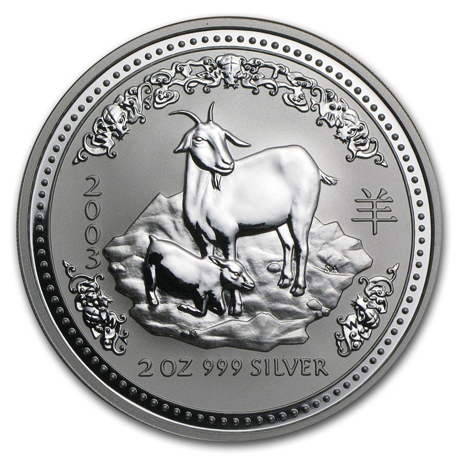 Stříbrná mince z roku 2003 váží 2 unce a je vyrobena ze stříbra ryzosti 0,999. Je věnována čínskému znamení zvěrokruhu Koza. Na reverzní straně, kterou navrhla výtvarnice Sarah Andersonová, je zobrazena koza s kůzletem na pozadí kamenů symbolizujících mír, harmonii a rodinné hodnoty. Na averzní straně je portrét Jejího Veličenstva královny Alžběty II. od Iana Rank-Broadleyho, stejně jako nominální hodnota a země vydání.
