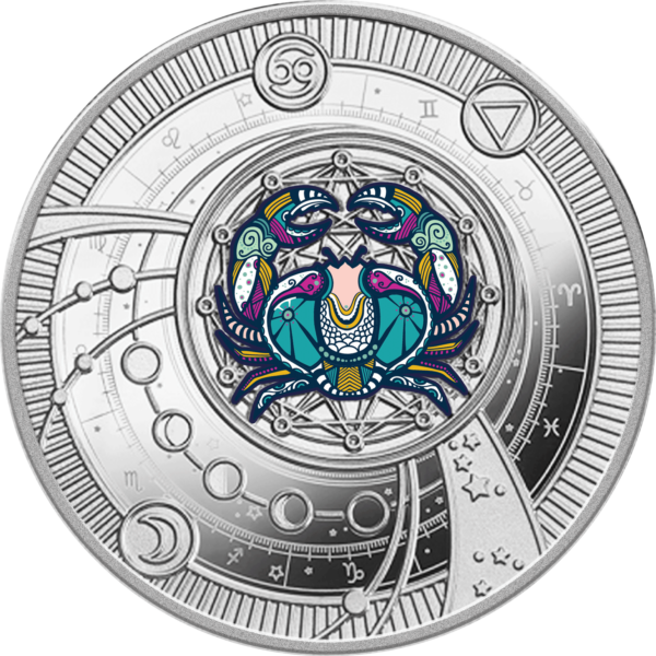Tato nádherná stříbrná mince je součástí série "Znamení zvěrokruhu" a je věnována Raku, symbolu intuice, ochrany a hluboké emocionality. Toto znamení, jemuž vládne Měsíc, ztělesňuje citlivost, věrnost a vrozený zájem o své blízké. Mince je ražena v kvalitě Proof, vyznačuje se detailním designem a sytými barvami. Elegantní kroužek s přívěskem ji umožňuje nosit jako šperk a mít tak symbol vnitřní harmonie a duševního klidu stále při sobě. Mince je vydávána v pouzdře s certifikátem pravosti a je přísně limitována na pouhých 599 kusů na celém světě.