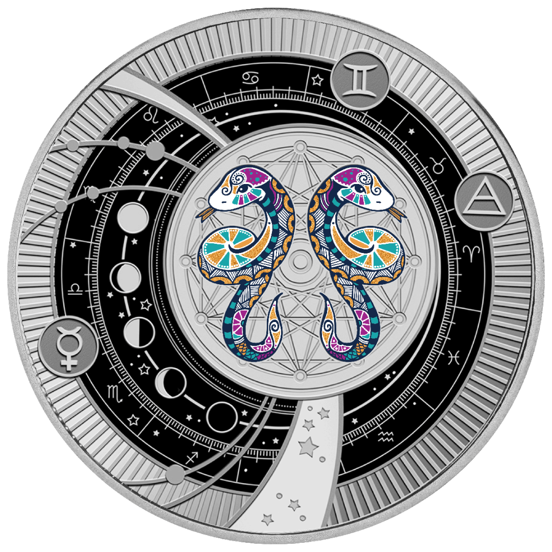Tato elegantní stříbrná mince ze série "Znamení zvěrokruhu" je věnována Blížencům, znamení, které ztělesňuje dualitu, zvědavost a neukojitelnou touhu po nových zážitcích. Mince je vyražena v kvalitě Proof a zaujme jasnou barvou a nádhernými detaily. Zvláštností mince je elegantní závěsný kroužek, který umožňuje její nošení jako stylového šperku. Na rubové straně jsou vyobrazeni dva hadi, kteří symbolizují zrcadlovou jednotu duší a magickou energii Blíženců. Mince je vydávána v pouzdře s certifikátem pravosti a je limitována pouhými 599 kusy na celém světě.
