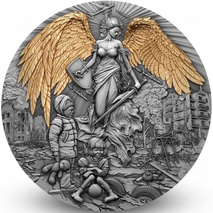 Tato nádherná dvě unce stříbrná mince ztělesňuje obraz anděla strážného - nebeského ochránce, který chrání lidi před zlem a utrpením. Na reverzní straně je vyobrazen anděl s mečem a štítem, který chrání děti před neštěstím. Působivý reliéf, nádherné zlacení a starožitná povrchová úprava vytvářejí působivý pocit hloubky a světla. Mince je vydána v limitovaném nákladu 500 kusů pro celý svět a je dodávána s certifikátem pravosti.
