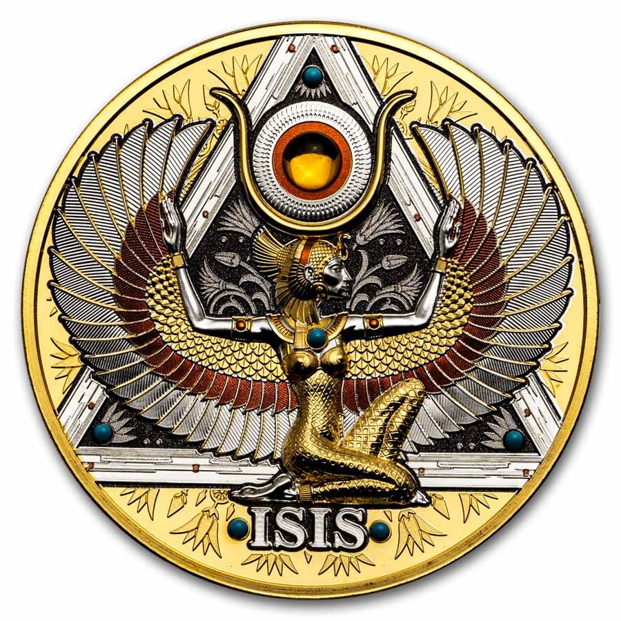 Tato působivá stříbrná mince je součástí série "Zlatá velikost" a je věnována staroegyptské bohyni Isis, božstvu mateřství, magie a ochrany.