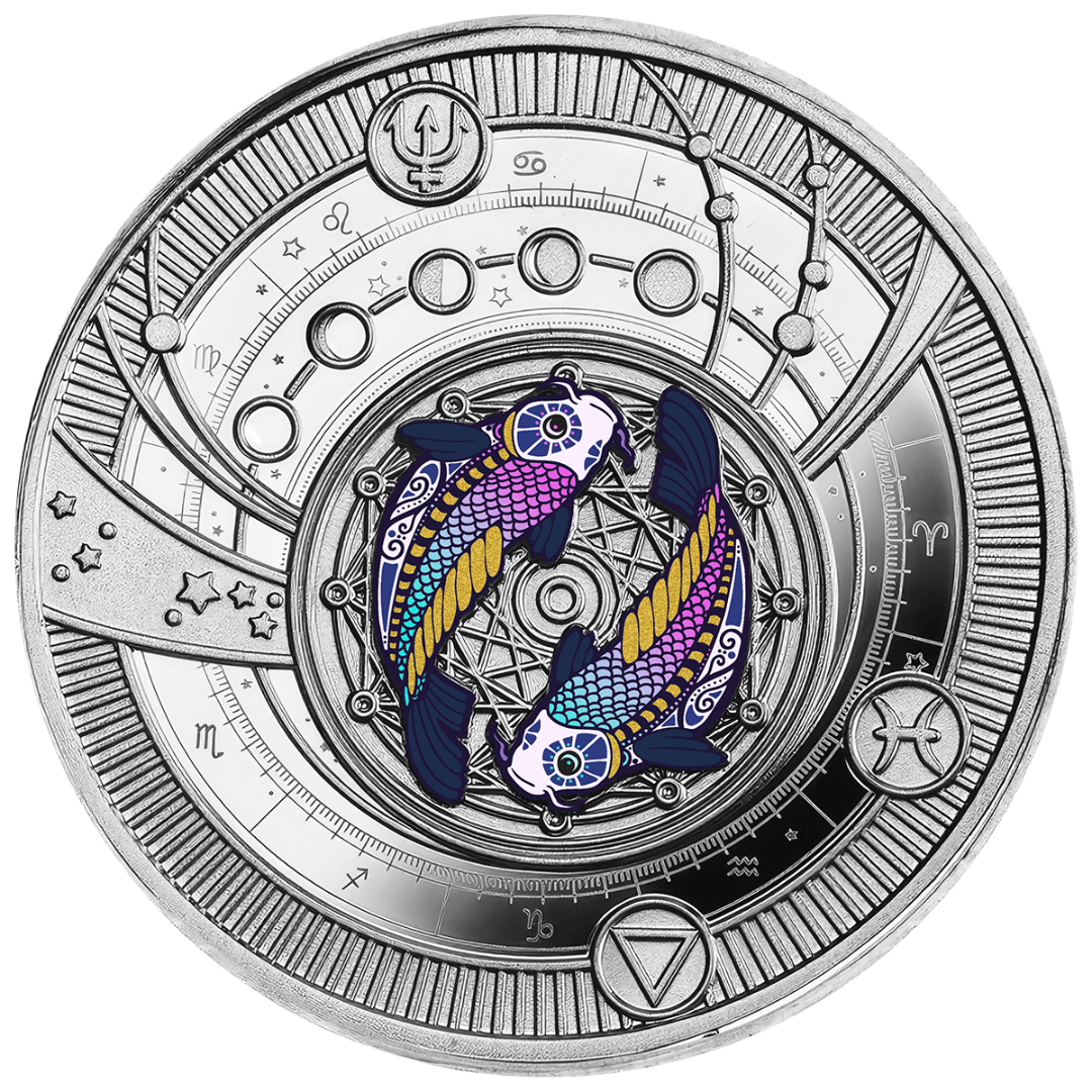 Tato nádherná stříbrná mince je součástí série "Znamení zvěrokruhu" a je věnována Rybám, tajemnému a smyslnému vodnímu znamení, kterému vládne Neptun. Ztělesňuje hloubku intuice, emocionalitu a uměleckou povahu lidí narozených v tomto znamení. Mince je vyražena v kvalitě Proof a vyznačuje se filigránovými detaily a jasným barevným akcentem. Elegantní kroužek s přívěskem umožňuje její nošení jako šperku a zdůrazňuje vytříbený styl a vnitřní harmonii majitele. Mince je vydávána v pouzdře s certifikátem pravosti a je přísně limitována na pouhých 599 kusů na celém světě.