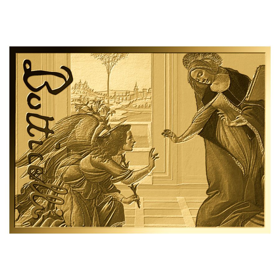 Tato nádherná zlatá mince je věnována slavnému mistrovskému dílu Sandra Botticelliho "Zvěstování z Cestella", které vytvořil v roce 1489. Ústřední motiv odráží okamžik příchodu archanděla Gabriela k Panně Marii, scénu plnou harmonie, jemnosti linií a duchovní hloubky. Dodává se v prezentačním blistru s certifikátem pravosti. Limitováno 50 000 kusy po celém světě.