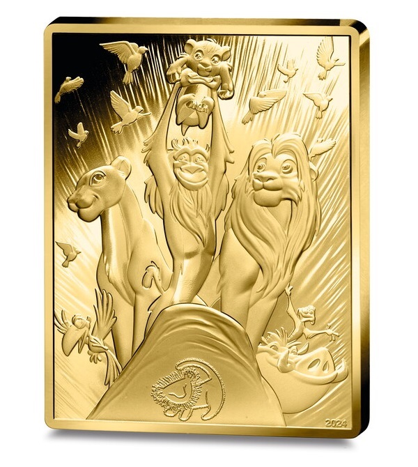 Tato sběratelská mince, vyražená v kvalitě Proof z ryzího zlata o hmotnosti 1 unce, připomíná 30. výročí filmu Lví král od společnosti Disney. Příběh Simbovy cesty od ztráty a pochybností o sobě samém k vůdcovství a obnovení harmonie se stal jedním z nejoblíbenějších animovaných mistrovských děl v historii kinematografie. Na oslavu tohoto milníku vytvořila Monnaie de Paris nostalgickou poctu ikonickým postavám filmu. Obdélníkový design znázorňuje závěrečnou scénu, v níž Simba a Nala představují svého syna Kiona Zemi pýchy, vyzdviženého Rafikim nad Skalou pýchy. Na rubové straně je majestátně vyobrazen Mufasa tyčící se nad skalním útvarem, doplněný nominální hodnotou 200 eur a iniciálami Francouzské republiky. Náklad je celosvětově omezen na pouhých 250 kusů.
