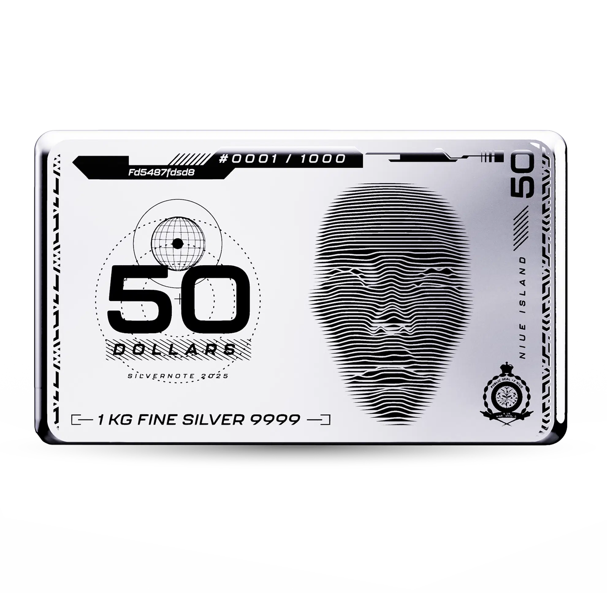 Sběratelská stříbrná mince Niue 2025 kombinuje formát slitku se statusem zákonného platidla. Je vyražena z 1 kilogramu stříbra o ryzosti 0,9999, má nominální hodnotu 50 NZD a je celosvětově omezena na pouhých 1 000 kusů. Obdélníkový formát (93,5 × 58 mm, tloušťka 18,5 mm) umocňuje její moderní a technickou estetiku. Design zahrnuje grafické prvky v bezpečnostním stylu, sériové číslování a stylizovaný portrét tvořený dynamickými liniemi. Výrazný nápis "50 DOLLARS" zdůrazňuje její status zákonného platidla, zatímco "1 KG FINE SILVER 9999" zdůrazňuje její investiční čistotu. Díky vysoké ryzosti, značné hmotnosti a omezenému nákladu vyniká tato kilová stříbrná mince jako výrazná emise, která oslovuje jak sběratele, tak seriózní investory do drahých kovů.