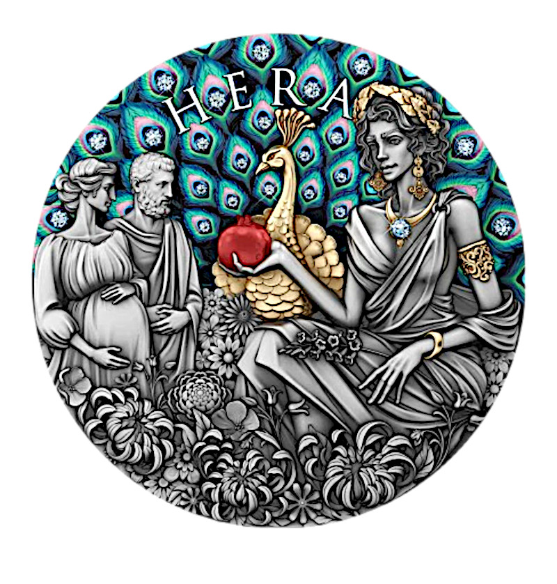 Tato nádherná stříbrná mince o hmotnosti 2 oz je součástí série "Božská krása" a oslavuje věčné hodnoty moudrosti, síly, rodiny a věrnosti - ctnosti, které ztělesňuje Héra, královna bohů.
