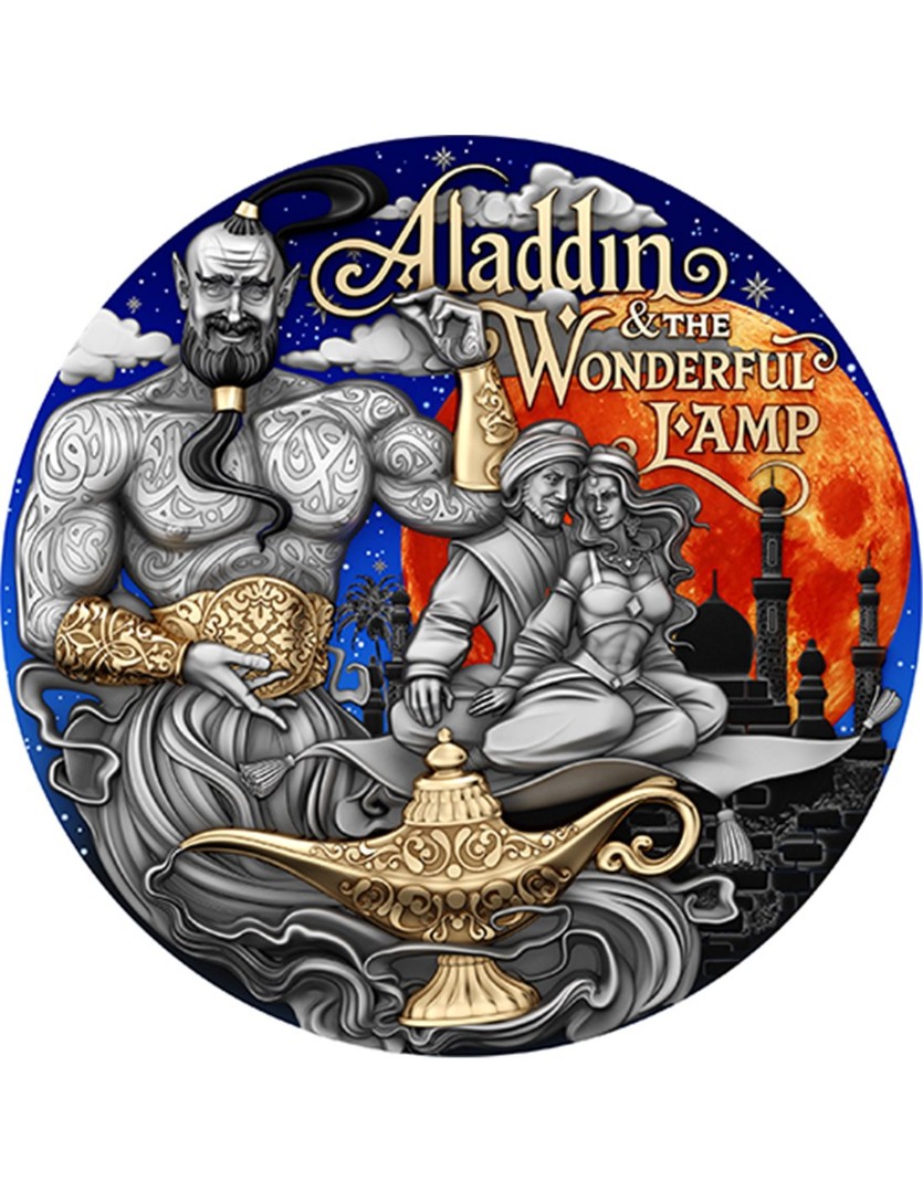 Tato okouzlující stříbrná mince o hmotnosti 2 uncí je součástí série Pohádkové příběhy a je věnována legendě o Aladinovi, mladém snílkovi, jehož odvaha změnila jeho osud. Středem návrhu je scéna, v níž se Aladin a Jasmína vznášejí na kouzelném koberci pod ohnivým měsícem, na nějž dohlíží majestátní Džin, strážce tajemství přání a svobody. Mince má starožitnou povrchovou úpravu vylepšenou selektivním zlacením a výrazným UV tiskem. Dodává se v pouzdře s certifikátem pravosti. Limitovaný náklad činí pouhých 500 kusů na celém světě.