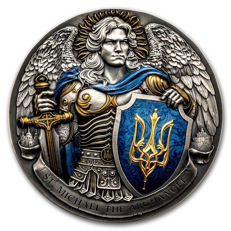 Tato významná stříbrná mince o hmotnosti 5 uncí je věnována svatému archandělu Michaelovi, nadčasovému symbolu naděje, síly a ochrany. Mince je vyražena s antickou povrchovou úpravou a vysokým reliéfem, je obohacena částečným barevným tiskem a opatřena číslovanou hranou, což podtrhuje její sběratelský charakter. Obraz archanděla Michaela, vyvedený v barvách ukrajinské vlajky, přináší silné poselství duchovního opatrovnictví a božské podpory v těžkých chvílích. Mince je dodávána v pouzdře a je k ní přiložen certifikát pravosti. Náklad je celosvětově omezen na pouhých 500 kusů.