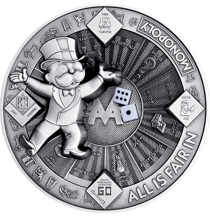 Tato úžasná stříbrná mince o hmotnosti 10 oz připomíná 90. výročí kultovní hry Monopoly, která spojuje rodiny a přátele po celém světě. Mince je opatřena vícevrstvou ražbou, která vytváří působivý 3D efekt a je doplněna skutečnou 3D kostí. Na designu je vyobrazen oblíbený pan Monopoly a ikonické prvky herní desky. Dodává se v předváděcím pouzdře s certifikátem pravosti. Náklad je přísně omezen na pouhých 250 kusů po celém světě.