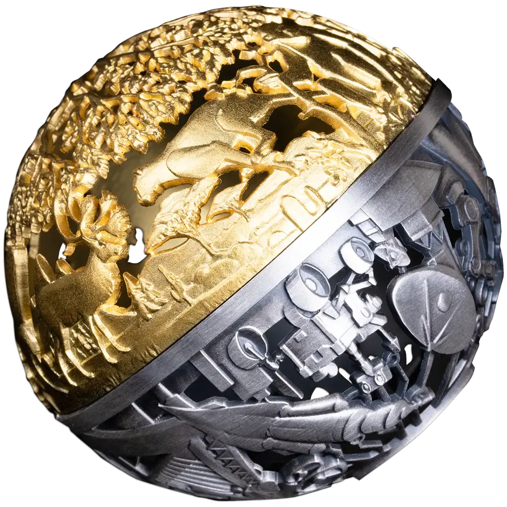 Tato výjimečná stříbrná mince ve tvaru koule o hmotnosti 2 unce ztělesňuje harmonii mezi prvotními silami přírody a rychlým technologickým pokrokem lidstva. Její neobvyklý tvar posiluje koncept rovnováhy a dodává designu výrazně futuristický a zapamatovatelný charakter. Starožitná povrchová úprava v kombinaci s ultrajemným filigránem a 24karátovým pozlacením podtrhuje hloubku uměleckého pojetí a řemeslnou zručnost, která za šperkem stojí. Mince je dodávána v pouzdře s certifikátem pravosti. Limitovaný náklad činí pouze 1 499 kusů na celém světě.