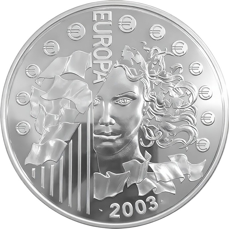 Tato sběratelská stříbrná mince vydaná Monnaie de Paris připomíná první výročí zavedení eura jako společné evropské měny. Mince je ražena v kvalitě Proof ze stříbra o ryzosti 0,925, obsahuje 925 g ryzího stříbra a má průměr 100 mm. Její nominální hodnota je 50 eur a náklad je omezen na 10 000 kusů. Averz mince čerpá inspiraci z minojského umění a zobrazuje motivy chobotnic a názvy dvanácti zemí eurozóny. Je na ní rovněž zobrazen nominál a nápis RÉPUBLIQUE FRANÇAISE. Reverzní strana představuje portrét bohyně Evropy s hvězdami vetkanými do vlasů, doplněný nápisem EUROPA a letopočtem 2003. Tato mince je zákonným platidlem ve Francouzské republice a je vydávána s certifikátem pravosti.