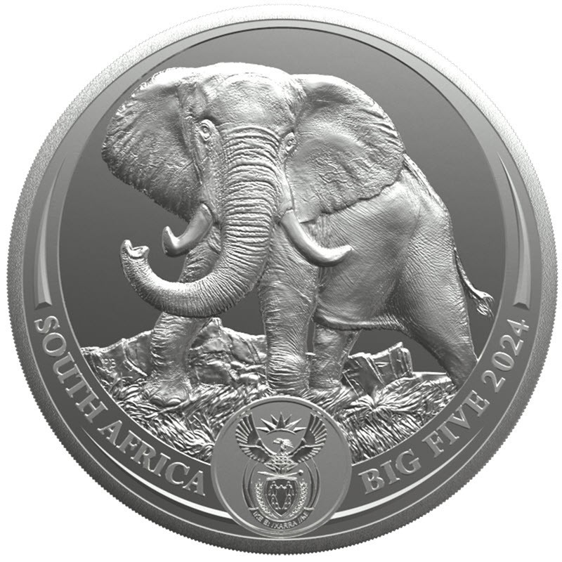 Slon 2024 je první kilovou emisí z nové série Big Five III jihoafrické mincovny. Tato působivá mince, vyražená z 1 kilogramu (32,15 unce) ryzího stříbra o ryzosti 0,999 v kvalitě Proof, nese nominální hodnotu 5 randů a je přísně limitována pouhými 100 kusy pro celý svět. Každá mince je dodávána v originální dřevěné krabičce s číslovaným certifikátem pravosti. Tato emise představuje historicky druhý kilogramový stříbrný slon. Na averzní straně je zobrazen dospělý africký slon s celým tělem, doplněný nápisy "SOUTH AFRICA", "BIG FIVE 2024" a státním znakem. Reverzní strana navazuje na koncepci signaturní série: dvě poloviny sloní hlavy tvoří po přiložení dvou mincí k sobě kompletní portrét zblízka. Více mincí umístěných vedle sebe vytváří vizuální dojem celého stáda. Ve středu je zobrazen nápis "FIVE RAND", "1kg" a "Ag 999".