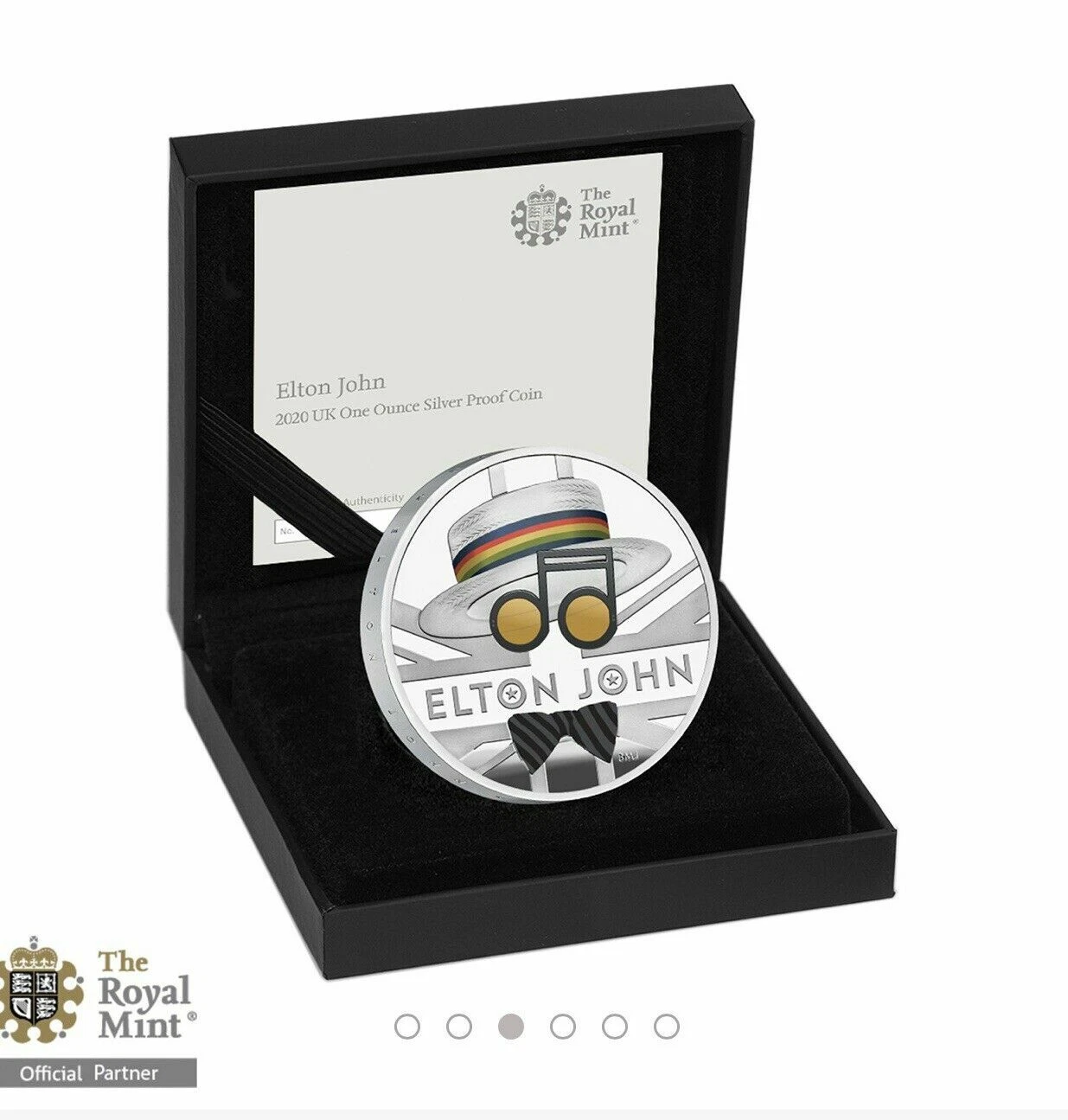 Druhá stříbrná mince ze série "Hudební legendy" je věnována legendárnímu britskému interpretovi Eltonu Johnovi. Na reverzní straně jsou vyobrazeny jeho ikonické atributy - kulaté brýle, klobouk a motýlek - symbolizující jeho jedinečný styl. Sir Elton Hercules John je vynikající zpěvák, klavírista a skladatel, který významně ovlivnil vývoj soft rocku a stal se jedním z komerčně nejúspěšnějších britských sólových umělců 70. let 20. století. Mince je ražena v kvalitě Proof a je opatřena speciálním barevným provedením zvýrazňujícím osobitou podobu Eltona Johna. Mince je vydána v originálním pouzdře s certifikátem pravosti a je limitována počtem 7 500 kusů pro celý svět.