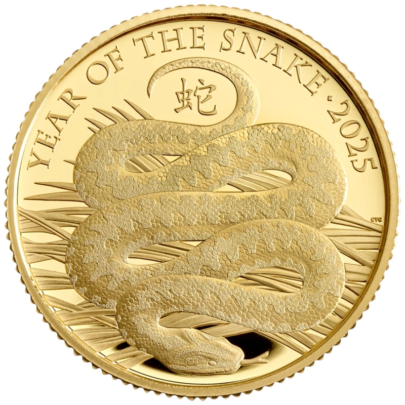 Tato mince z lunární série oslavuje rok hada a je vyražena ze zlata o ryzosti 999,9 ve standardu Proof, má nominální hodnotu 25 liber, průměr 22 mm a frézovanou hranu. Maximální náklad je omezen na 398 kusů. Tato emise, která navazuje na britskou lunární sérii, kombinuje vytříbené umělecké zpracování s výjimečnou čistotou zlata. V lunárním zvěrokruhu symbolizuje Had moudrost, vhled a strategické myšlení - je znamením vnitřní síly a intuitivního uvědomění. Reverzní strana, navržená Chrisem Costellem, obsahuje elegantně propracované miniaturní vyobrazení svinutého hada. Averz nese oficiální portrét krále Karla III. od Martina Jenningse.