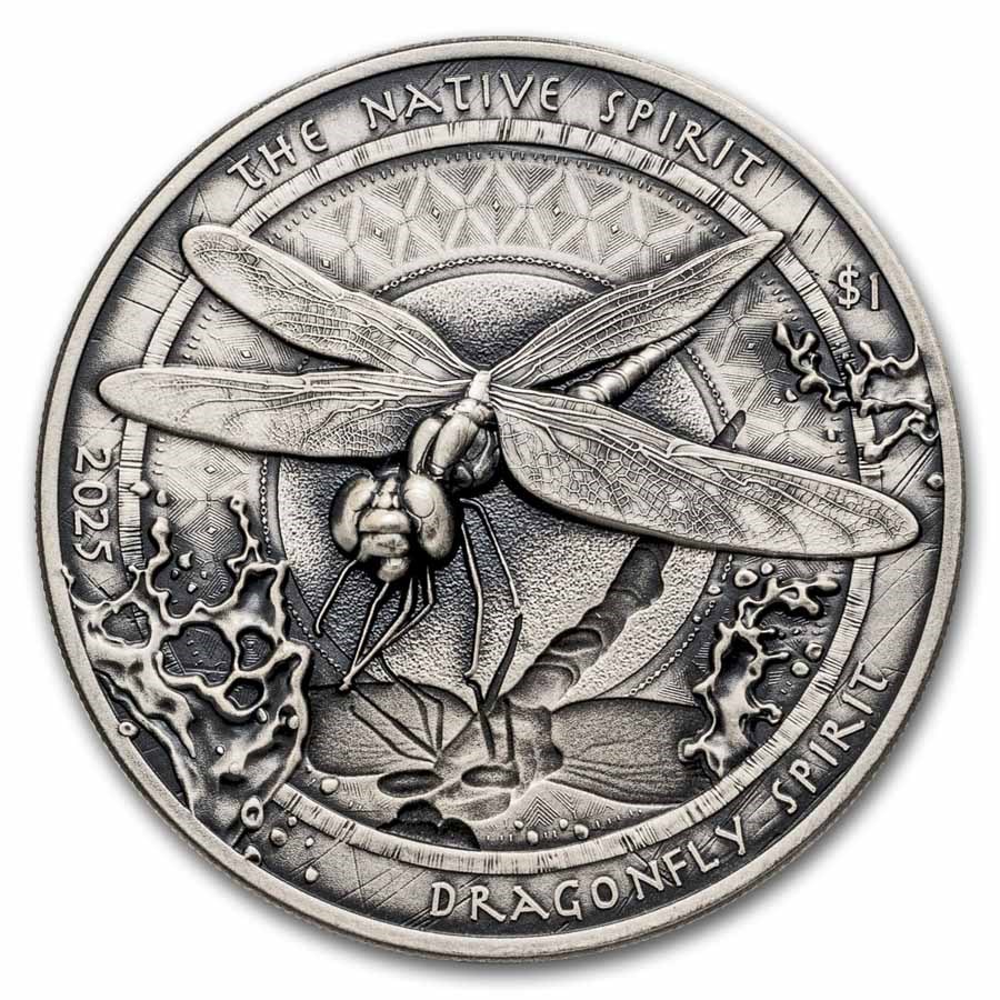 Tato stříbrná mince z roku 2025 patřící do série Spirit of Native Peoples je vyražena z 1 unce ryzího stříbra o ryzosti 0,999 a je na ní vyobrazena symbolická vážka. Tato mince představuje témata změny, transformace a vnitřního růstu spojená s tímto tvorem. Starožitná povrchová úprava dodává designu výraznou hloubku a expresivní charakter. Reverzní strana představuje detailní vyobrazení vážky obklopené vodními prvky, které zdůrazňuje její přirozené prostředí. Kompozice kombinuje symbolický význam s jemnou rytinou a vyváženým designem. Náklad je celosvětově omezen na 2 500 kusů.
